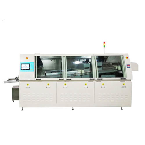 I PCB con componenti montati vengono alimentati automaticamente nel sistema di trasporto a catena, procedendo attraverso i processi di spruzzatura del flusso, preriscaldamento, saldatura a onda e raffreddamento prima di uscire dal sistema.